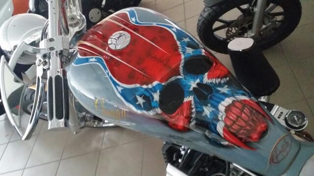 Show Bike Dixie Choppa costruito dalla Biker Sheriff nel 2007 con componenti americani di altissima qualità e completamente omologata! la moto è stata pubblicata su Bikerslife del giugno 2006 ed ha vinto vari premi! il chopper ha come tema la guerra fra sudisti e nordisti e tutte le areografie sono state eseguite dalla Artechdesign ecco l'elenco delle modifiche principali: revtech evolution 110"1800cc 120 HP accensione: revtech carburatore: mikuni 50 filtro: force winder trasmissione: primo belt drive Brute IV frizione: Riviera con 8 dischi barnett rinforzati nuovi cavo frizione: barnett kit riduttore sforzo frizione del 40% cinghia: BDL da 3" a secco telaio: Santeè single down tube, canotto 43° strech 4" forcelle: SJP Ammortizzatori: Progressive ad aria con compressore regolabili in altezza Scarico: BSL con tappo Supertrapp Cerchi: ricavati dal pieno con disegno fatto su ordinazione Gomme: avon cobra 1207021 e 2504018 impianto frenante: Arlen Ness 4 pistoncini freno posteriore integrato nella corona comandi avanzati: Arlen Ness piastre ricavate dal pieno faro Harley, ecc......